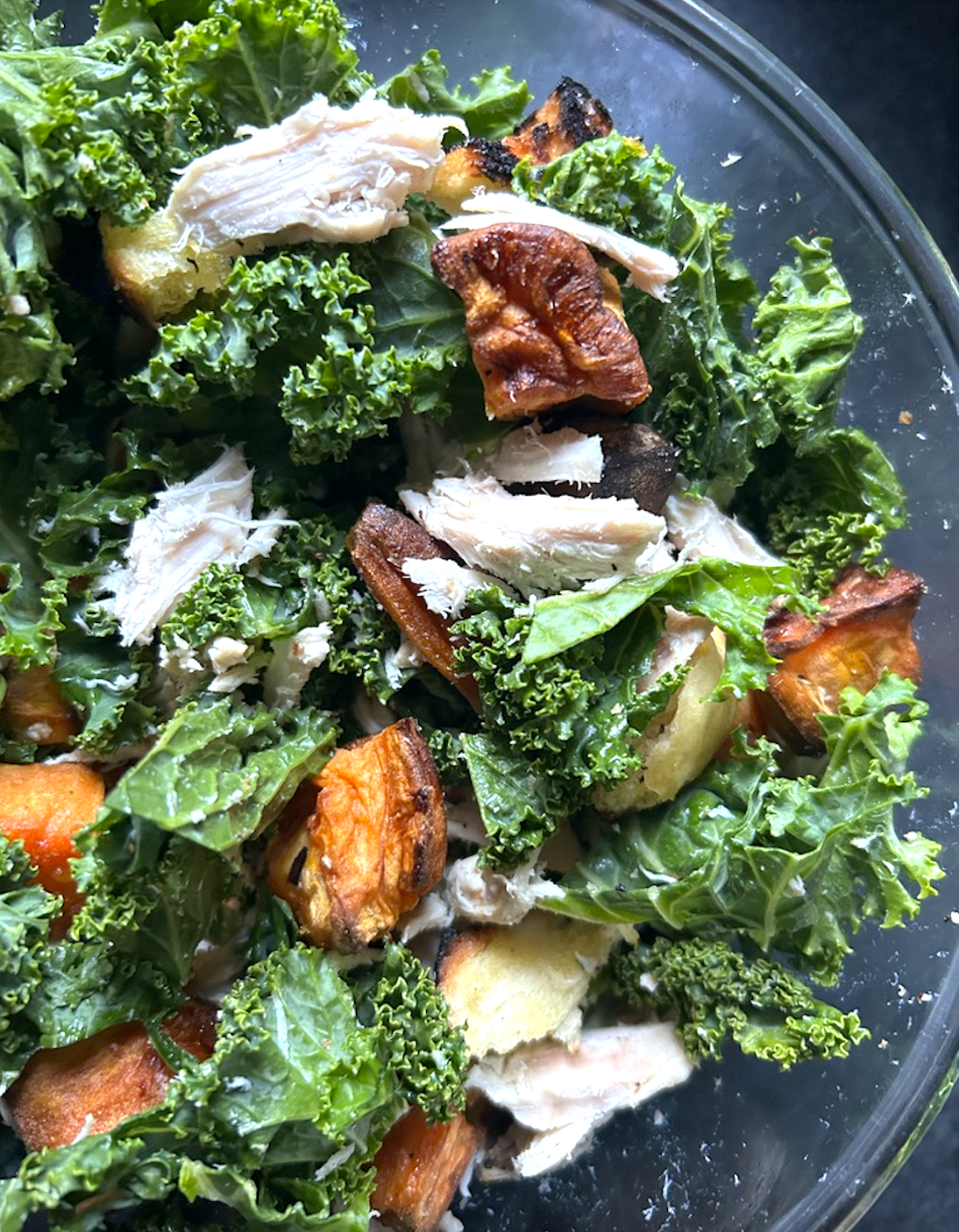 La salade de kale au poulet et à la patate douce rôtie est l’une de mes salades préférées. Saine et équilibrée, elle est aussi très appétissante. Le goût sucré et caramélisé de la patate douce, la saveur naturelle du chou kale, le croquant des croûtons constituent un parfait mariage pour accompagner le poulet tout en le rehaussant.